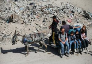 Palestinians make their way with belongings as they fled their homes, after Israeli air strikes, in the northern Gaza Strip May 16, 2025. REUTERS/Mahmoud Issa