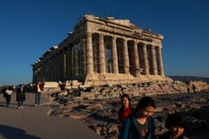 FILE PHOTO: Tourists walk in front of the Parthenon temple atop the Ancient Acropolis archaeological site, in Athens, Greece, January 19, 2025. REUTERS/Louiza Vradi/File photo