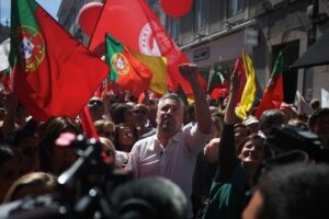 Socialist party (PS) Secretary General Pedro Nuno Santos gestures to the crowd during a rally on the last day of the campaign ahead of the snap elections on Sunday, in Lisbon, Portugal, May 16, 2025. REUTERS/Pedro Nunes