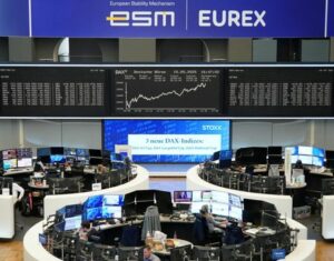 FILE PHOTO: The German share price index DAX graph is pictured at the stock exchange in Frankfurt, Germany, May 15, 2025. REUTERS/staff/File Photo