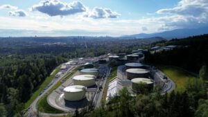 FILE PHOTO: A drone view of the Trans Mountain Burnaby Terminal tank farm as the Canadian government-owned Trans Mountain pipeline expansion project became operational in Burnaby, British Columbia, Canada May 1, 2024. REUTERS/Jennifer Gauthier/File photo