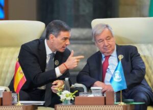 Spanish Prime Minister Pedro Sanchez and UN Secretary-General Antonio Guterres attend the 34th Arab League summit, in Baghdad, Iraq, May 17, 2025. Hadi Mizban/Pool via REUTERS