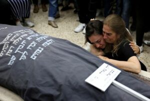 Relatives and friends of Tzeela Gez, who was shot dead in the West Bank while driving to hospital with her husband to give birth, mourn during her funeral in Jerusalem, May 15, 2025. REUTERS/Ronen Zvulun TPX IMAGES OF THE DAY