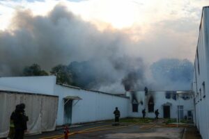 Firefighters work at the site of a private enterprise hit by a Russian drone strike, amid Russia’s attack on Ukraine, outside of Kyiv, Ukraine May 18, 2025. REUTERS/Valentyn Ogirenko