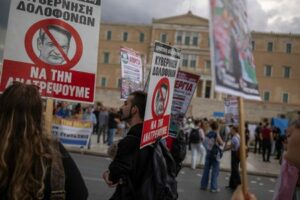 Protesters holds placards depicting Greek Prime Minister Kyriakos Mitsotakis during a demonstration marking a 24-hour general strike against a labour reform extending a 13-hours workday to workers with one job, in Athens, Greece, October 1, 2025. The placards read “Government of murderers, let’s overturn it”. REUTERS/Alkis Konstantinidis