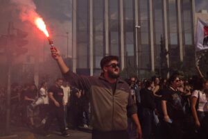 A university student holds a flare during a demonstration marking a 24-hour general strike to protest a labour reform extending a 13-hours workday to workers with one job, in Athens, Greece, October 1, 2025. REUTERS/Alkis Konstantinidis