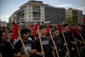University students shout slogans during a demonstration marking a 24-hour general strike against a labour reform extending a 13-hours workday to workers with one job, in Athens, Greece, October 1, 2025. REUTERS/Alkis Konstantinidis