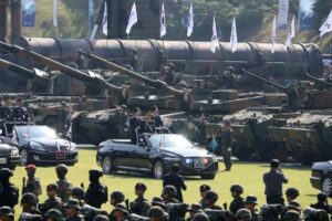 South Korean President Lee Jae Myung and Defense minister Ahn Gyu-back inspect military assets during a celebration to mark 77th Armed Forces Day in Gyeryong, South Korea, October 1, 2025. REUTERS/Kim Hong-Ji/Pool