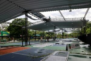 Workers repair roofs of tennis courts after Typhoon Bualoi made landfall in Nghe An province, Vietnam, September 30, 2025. REUTERS/Thinh Nguyen