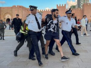 FOTO DE ARCHIVO. Miembros de las fuerzas de seguridad detienen a un hombre mientras impiden que tenga lugar una protesta en demanda de reformas en educación y sanidad, en Rabat, Marruecos. 29 de septiembre de 2025. REUTERS/Ahmed El Jechtimi