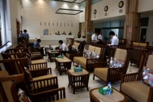 Japanese citizens sit in the lobby of the AJU Imperial hotel in Vithalapur village, Gujarat, India, August 26, 2025. REUTERS/Amit Dave