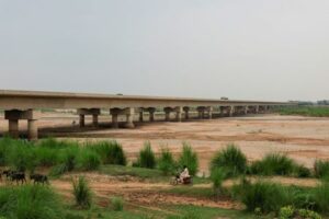 A person rides on motorbike by the dry river bed of Jhelum River in the background in Bhera, Sargodha District, in Punjab province, Pakistan August 14, 2025. REUTERS/Akhtar Soomro