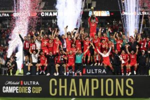 Jugadores de Toluca celebran con el trofeo tras ganar la Campeones Cup ante LA Galaxy. Dignity Health Sports Park, Carson, California, EEUU. 1 de octubre de 2025.