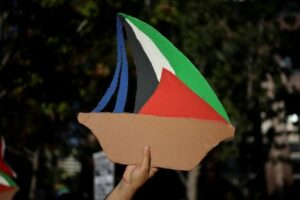 Un manifestante propalestino sostiene una pancarta que representa un barco de la Global Sumud Flotilla que pretende llegar a Gaza y romper el bloqueo naval de Israel durante una protesta para condenar la interceptación por parte de las fuerzas israelíes de algunos de los barcos de la Global Sumud Flotilla que pretenden llegar a Gaza y romper el bloqueo naval de Israel, frente al Consulado General de Israel en Los Ángeles, California, EEUU. 2 de octubre de 2025. REUTERS/Daniel Cole
