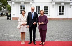 Saarland’s State Premier Anke Rehlinger (R) welcomes Germany’s Chancellor Friedrich Merz (C) and his wife Charlotte Merz as they arrive for central celebrations on the Day of German Unity in Saarbruecken, southwestern Germany On October 3, 2025, Germany marks the 35th anniversary of the German Reunification. JEAN-CHRISTOPHE VERHAEGEN/Pool via REUTERS