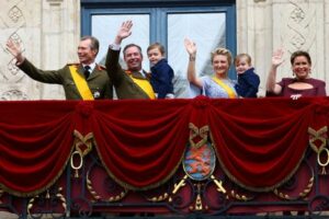 Luxembourg’s Grand Duke Guillaume, his wife Grand Duchess Stephanie, Prince Charles, Prince Francois, Grand Duke Henri and Grand Duchess Maria Teresa appear on the balcony of the Grand Ducal Palace in Luxembourg, October 3, 2025. REUTERS/Yves Herman