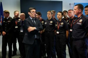 Der Bürgermeister von Greater Manchester, Andy Burnham, besucht nach dem Anschlag auf die Synagoge im Norden von Manchester, Großbritannien, das Hauptquartier der Polizei von Greater Manchester. 3. Oktober 2025. REUTERS/Phil Noble/Pool