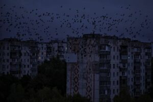 Vögel fliegen in der Nähe von Wohngebäuden während eines Stromausfalls, nachdem wichtige zivile Infrastruktur durch russische Militärangriffe in der Region Tschernihiw getroffen wurde, während Russlands Angriff auf die Ukraine in Tschernihiw, Ukraine, 2. Oktober 2025. REUTERS/Yan Dobronosov