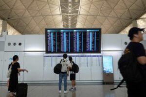 Passengers check flight information display screens at Hong Kong International Airport in Hong Kong, China June 16, 2025. REUTERS/Joyce Zhou