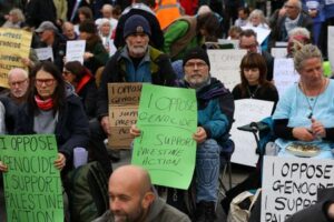 Protesters hold signs, during a mass demonstration organised by Defend our Juries, against the British government’s ban on Palestine Action, at Trafalgar Square in London, Britain, October 4, 2025. REUTERS/Toby Melville