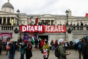 People attend a mass demonstration organised by Defend our Juries, against the British government’s ban on Palestine Action, at Trafalgar Square, in London, Britain, October 4, 2025. REUTERS/Jack Taylor