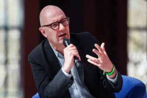 Member of parliament Roland Lescure of the Ensemble pour la Republique (EPR) parliamentary group, speaks as he attends a political rally of the Renaissance party in Saint-Denis near Paris, France, April 6, 2025. REUTERS/Tom Nicholson