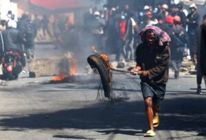 A protester runs while holding a burning tyre to barricade a road during a nationwide youth-led demonstration over frequent power outages and water shortages, in Antananarivo, Madagascar, October 6, 2025. REUTERS/Siphiwe Sibeko