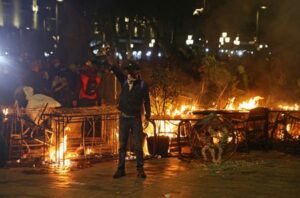 A protester gestures next to a burning barricade during an opposition rally on the day of local elections in Tbilisi, Georgia October 4, 2025. REUTERS/Irakli Gedenidze