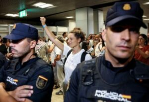 One of the Spanish activists who was part of the Global Sumud Flotilla and was detained by Israeli forces, gesture next to Police officers upon arrival at Adolfo Suarez Madrid-Barajas Airport in Madrid, Spain, October 5, 2025. REUTERS/Juan Medina