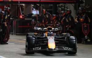 Foto del domingo del Red Bull de Max Verstappen saliendo de boxes durante el GP de Singapur de la F1