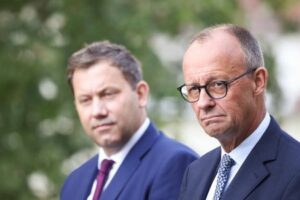 ARCHIV: Bundeskanzler Friedrich Merz schaut neben Vizekanzler und Finanzminister Lars Klingbeil bei einer Pressekonferenz am zweiten Tag einer zweitägigen Kabinettssitzung in der Villa Borsig zu, Berlin, Deutschland, 1. Oktober 2025. REUTERS/Liesa Johannssen
