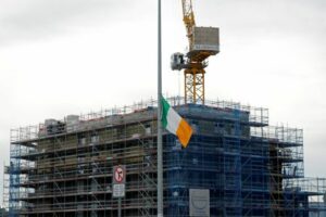 An Irish flag flutters in front of a construction site in the North Strand area, in Dublin, Ireland, September 29, 2025. REUTERS/Clodagh Kilcoyne