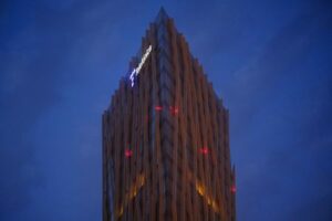 The logo of Spanish telecom company Telefonica is displayed at its headquarters, as the company evaluates cutting jobs to reduce its structural costs and improve efficiency, news website El Confidencial reported, in Barcelona, Spain May 3, 2025. REUTERS/Nacho Doce