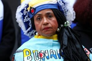 Plaintiff Jackie Bernabela protests with others in front of the district court, which hears a case brought by Greenpeace Netherlands and residents of the Dutch-Caribbean island of Bonaire, to force the Netherlands to take more measures to protect the island against the effects of climate change, in The Hague, Netherlands, October 7, 2025. REUTERS/Piroschka van de Wouw