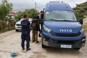 Migrants board a police van, after they have been found safe ashore in the south of the island, while four bodies were recovered at sea during a SAR operation, a coastguard official said, on the island of Lesbos, Greece, October 7, 2025. REUTERS/Elias Marcou