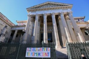 A placard which reads “Gisele, Women thank you”, in support of French woman Gisele Pelicot, the victim of a mass rape orchestrated by her then-husband Dominique Pelicot at their home in the southern French town of Mazan, hangs on the gates of the courthouse on the first day of the appeal hearing filed by one of the 51 people convicted in her rape trial, in Nimes, France, October 6, 2025. REUTERS/Alexandre Dimou