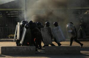 Police officers carry shields during a nationwide youth-led demonstration over frequent power outages and water shortages, in Antananarivo, Madagascar, October 7, 2025. REUTERS/Zo Andrianjafy