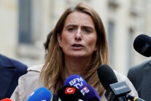 Marine Tondelier, National Secretary of Les Ecologistes (the Ecologists – EELV – French Green Party) party, talks to journalists after a meeting with French outgoing Prime Minister Sebastien Lecornu as part of consultations with French political parties, at the Hotel Matignon in Paris as France faces a political crisis following the announcement of the resignation of the new government, France, October 8, 2025. REUTERS/Stephanie Lecocq
