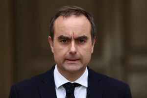 French outgoing Prime Minister Sebastien Lecornu, who presented his government’s resignation to the French president this morning, delivers a statement at the Hotel Matignon in Paris, France, October 6, 2025. REUTERS/Stephane Mahe/Pool