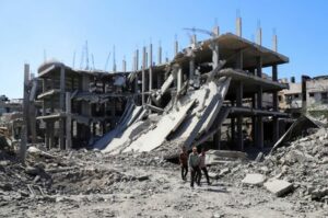 Palestinians walk past a destroyed building, as they inspect the damage in the aftermath of Israeli operation at Sabra neighbourhood in Gaza City, October 8, 2025. REUTERS/Ebrahim Hajjaj