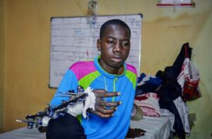 Asende Obato, 16, who was injured on his arm by an explosive device while playing, sits inside a ward at the Beni General Hospital in Beni, North Kivu Province of the Democratic Republic of Congo October 2, 2025. REUTERS/Gradel Muyisa Mumbere