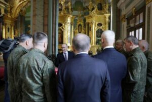 Russia’s President Vladimir Putin speaks with top military commanders and heads of security services as they visit Peter and Paul Cathedral in Saint Petersburg, Russia, October 7, 2025. Sputnik/Mikhail Metzel/Pool via REUTERS ATTENTION EDITORS – THIS IMAGE WAS PROVIDED BY A THIRD PARTY.