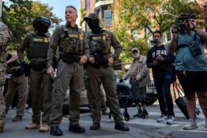 El agente jefe de patrulla del sector El Centro, Greg Bovino, está en una esquina con agentes federales después de patrullar varios distritos turísticos en el centro de la ciudad, luego de que el presidente de Donald Trump ordenara una mayor presencia policial federal para ayudar en la prevención del delito, en Chicago, Illinois, EEUU, el 28 de septiembre de 2025. REUTERS/Jim Vondruska