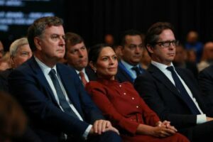 British Shadow Foreign Secretary Priti Patel, Shadow Chancellor of the Exchequer Mel Stride and Shadow Secretary of State for Northern Ireland Alex Burghart listen as Conservative Party Leader Kemi Badenoch (not pictured) delivers her keynote speech on the final day of the Conservative Party conference, in Manchester, Britain, October 8, 2025. REUTERS/Temilade Adelaja