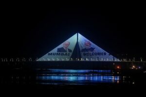 Images of Indian Prime Minister Narendra Modi welcoming British Prime Minister Keir Starmer are projected on the Bandra Worli Sea link, in Mumbai, India, October 8, 2025. REUTERS/Francis Mascarenhas