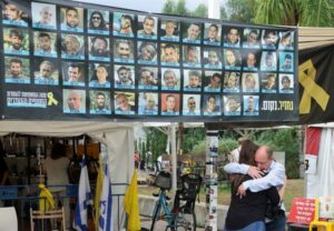Pancarta con fotos de los rehenes en la «plaza de los rehenes», después de que el presidente estadounidense Donald Trump anunciara que Israel y Hamás habían acordado la primera fase de un alto el fuego en Gaza, en Tel Aviv, Israel, el 9 de octubre de 2025. REUTERS/Ronen Zvulun