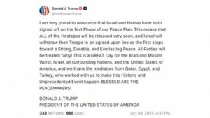 A screen grab of a post by U.S. President Donald Trump on his Truth Social account, announcing that Israel and Hamas have signed off on the first phase of the U.S.-proposed Gaza deal, allowing for the release of all Israeli hostages, on October 8, 2025. Social Media/via REUTERS THIS IMAGE HAS BEEN SUPPLIED BY A THIRD PARTY. NO RESALES. NO ARCHIVES