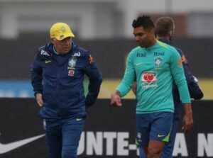 El entrenador de Brasil Carlo Ancelotti y Casemiro durante el entrenamiento de la selección para un partido de la eliminatoria al Mundial 2026