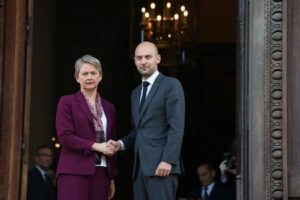 French Minister for Europe and Foreign Affairs Jean-Noel Barrot welcomes British Foreign Secretary Yvette Cooper prior to a Ministerial meeting on the implementation of the Middle East peace plan at the Quai d’Orsay in Paris, France, October 2025. Christophe Petit Tesson/Pool via REUTERS