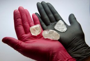 FILE PHOTO: An employee shows gem-quality stones, including a rare 242-carat rough diamond that will be offered at the 100th international auction of Russian state-controlled diamond producer Alrosa, during a presentation in Moscow, Russia February 25, 2021. The diamond is one of the biggest gem-quality stones Alrosa has mined this century, the company said. Picture taken February 25, 2021. REUTERS/Tatyana Makeyeva/File Photo